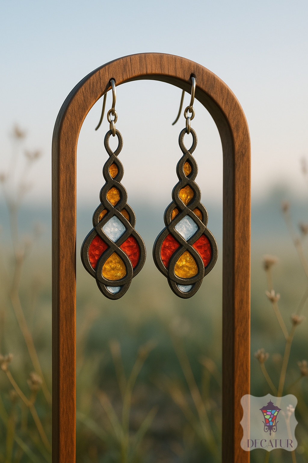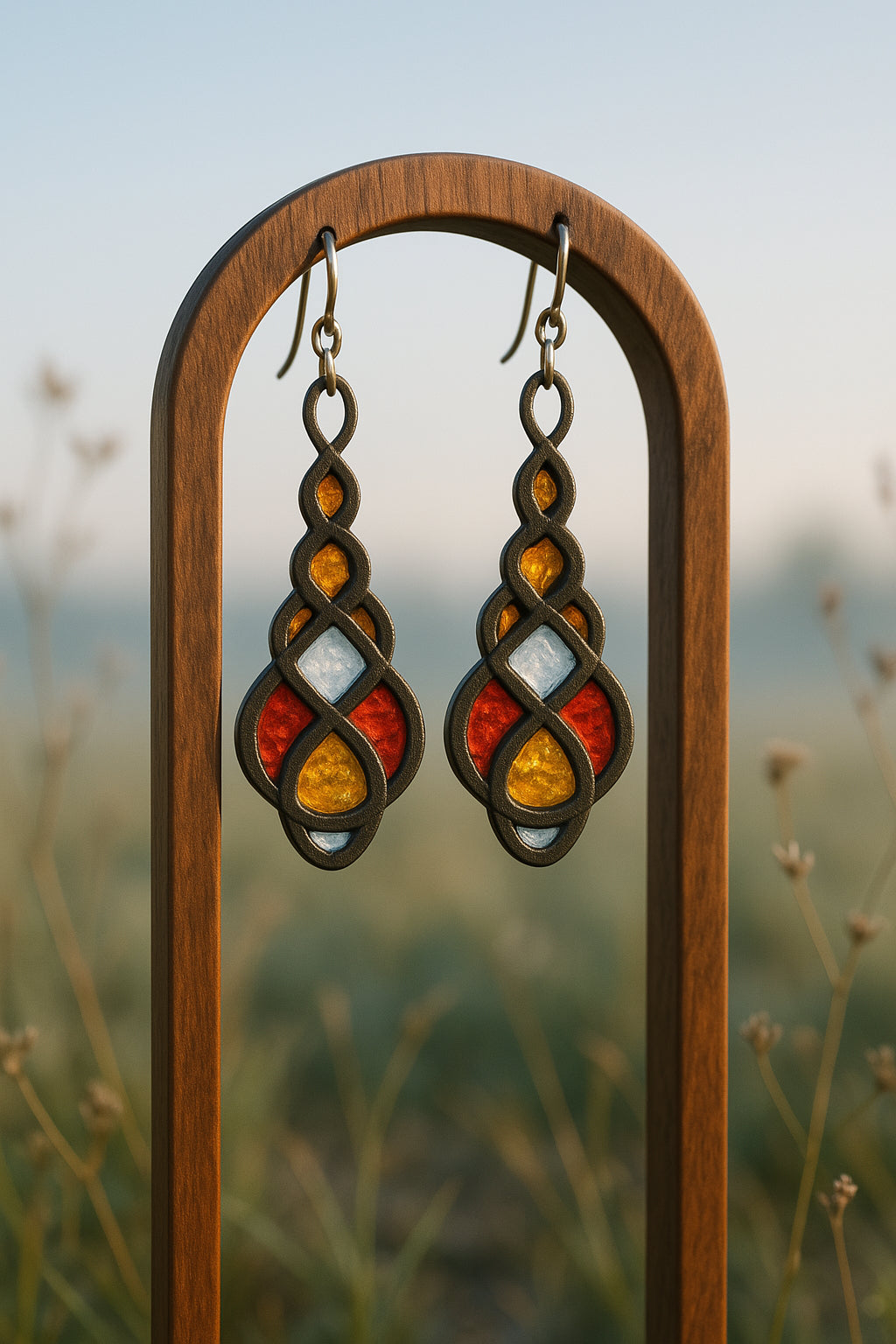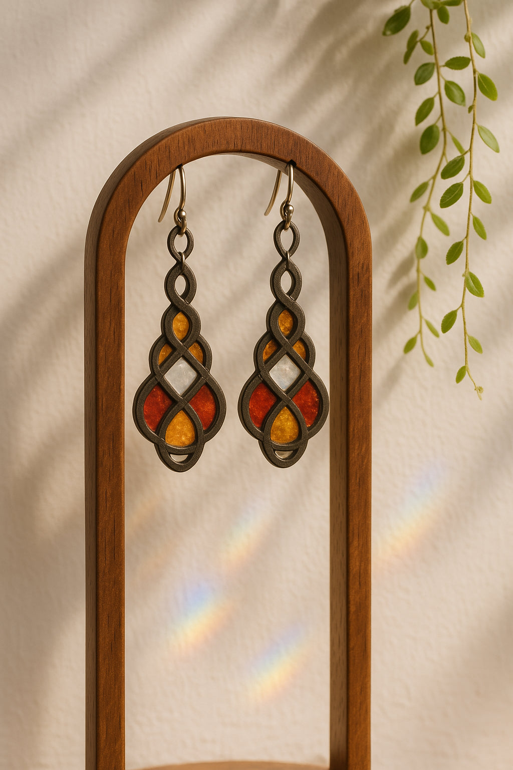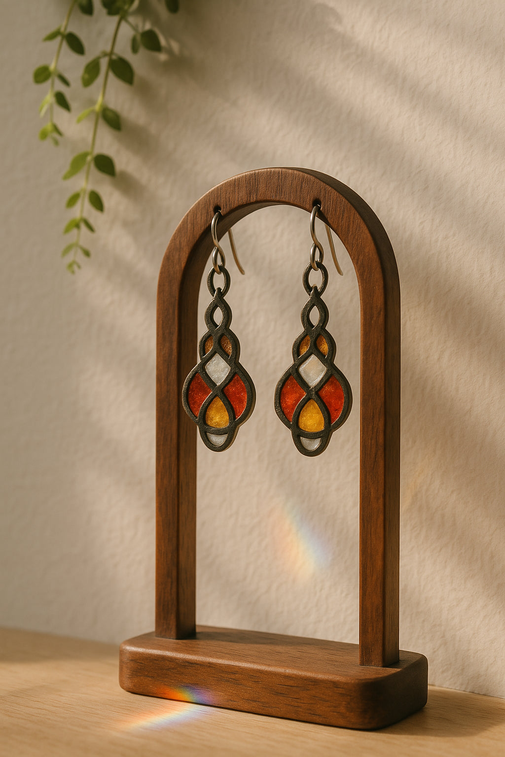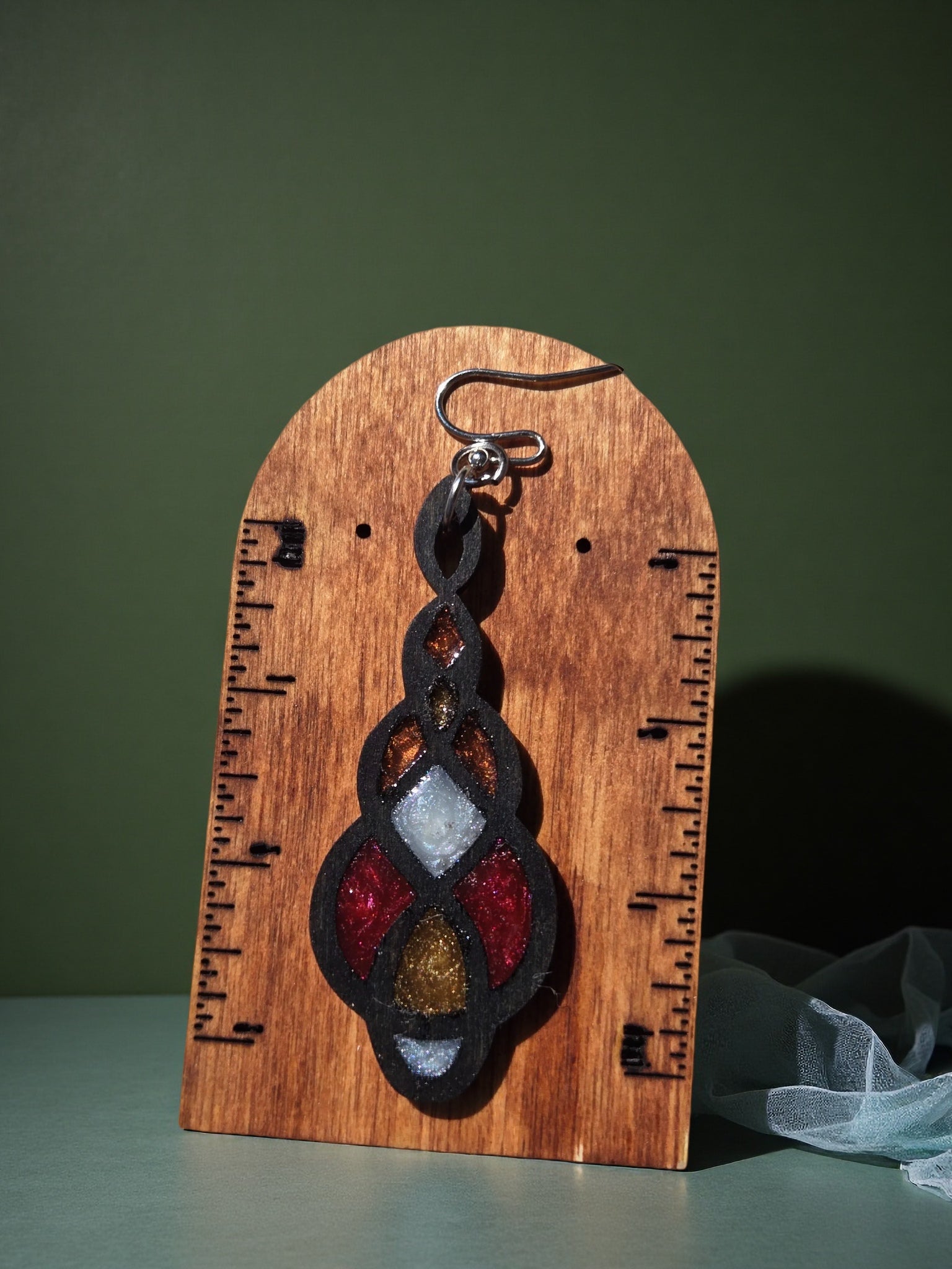 Crimson Bloom – Stained Glass-Inspired Earrings. Bold, handcrafted beauty meets stained glass charm. These lightweight earrings glow with rich crimson resin and intricate wood cutouts — perfect for turning heads in any light. These earrings are a stunning addition to any collection.