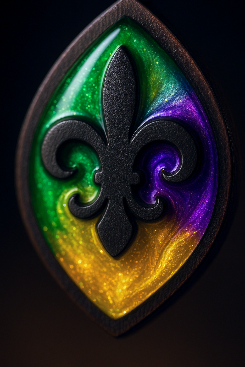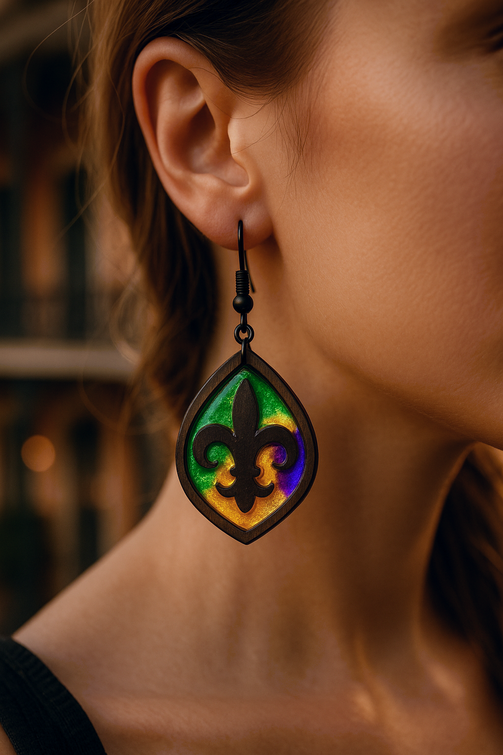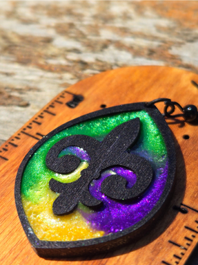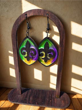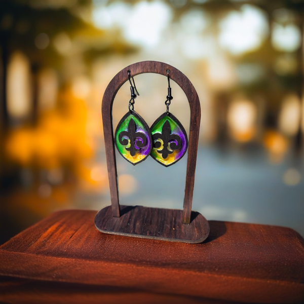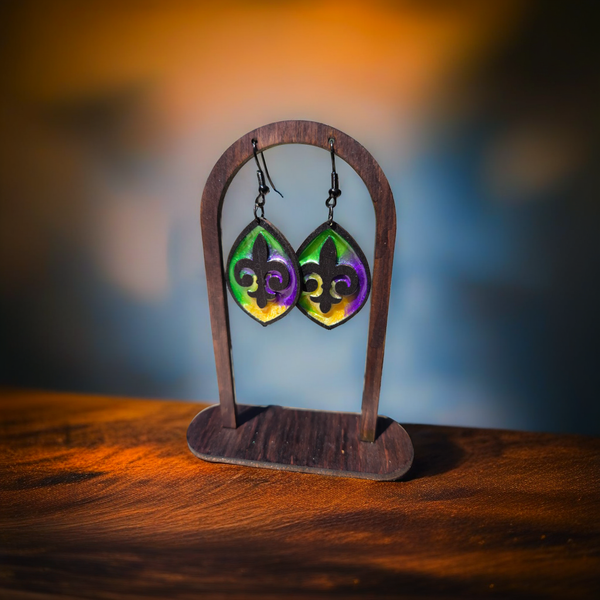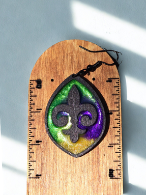Celebrate the spirit of Mardi Gras with the Fat Tuesday Earrings These bold, festive earrings channel the energy of New Orleans through a stained glass–inspired design. Handcrafted with shimmering resin and vibrant woodwork, each pair is a tribute to carnival color and creativity.