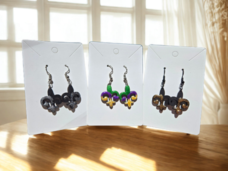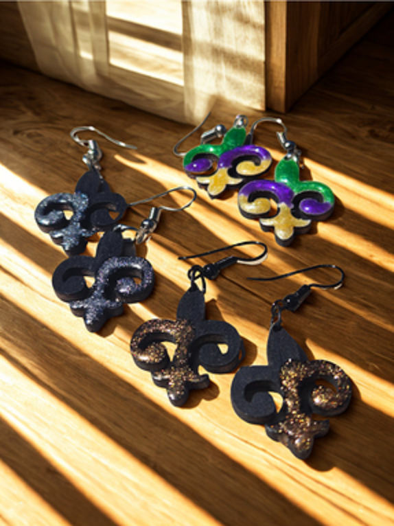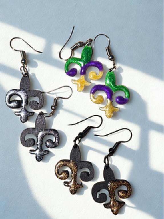 Petit Fleur Trio – 3 Pair Mini Earring Set Collect the entire mini fleur-de-lis collection with this beautifully coordinated 3-pair set. Each pair is handmade from wood and custom-dyed resin, reflecting the soul of New Orleans in shimmering gold, radiant silver, and festive Mardi Gras colors.